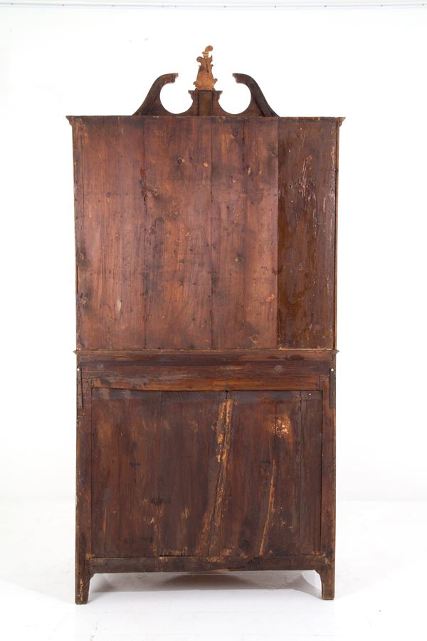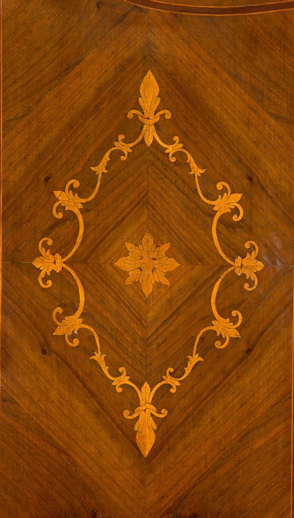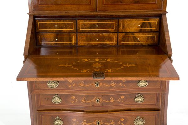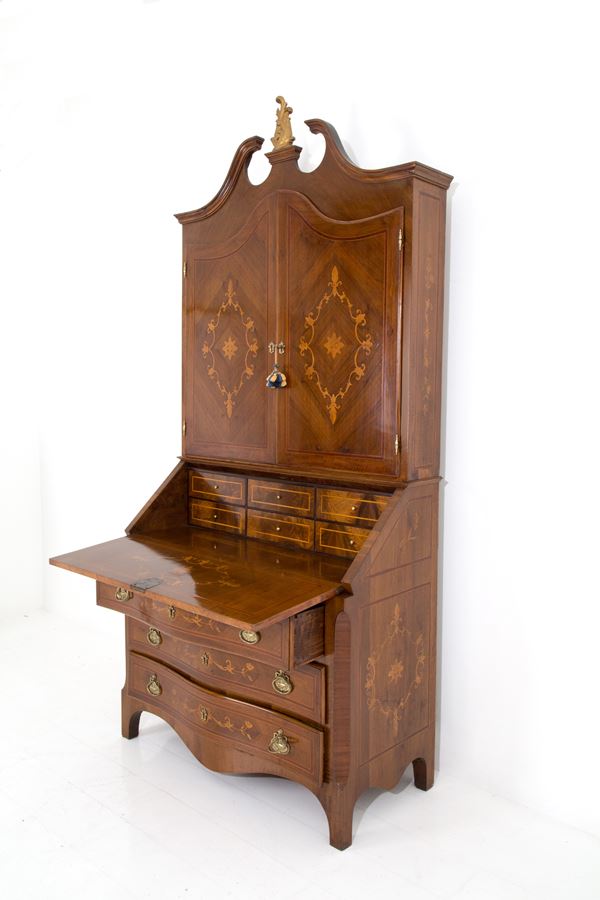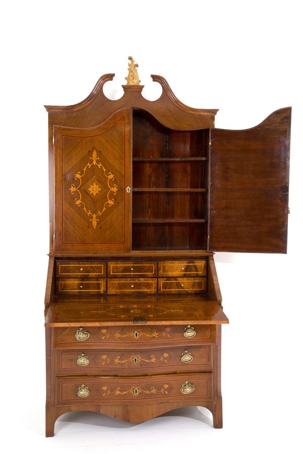 Bureau-trumeau lastronato in legni vari e intarsiato a motivi floreali. Inizi XIX secolo.