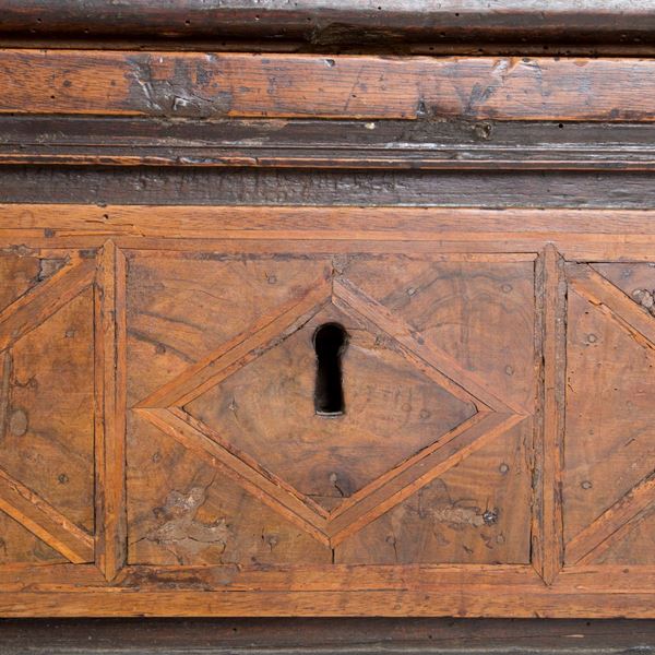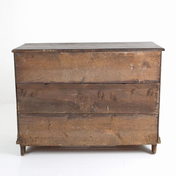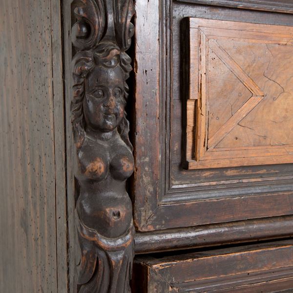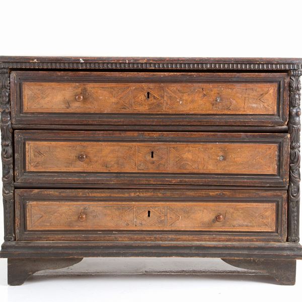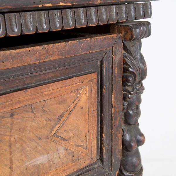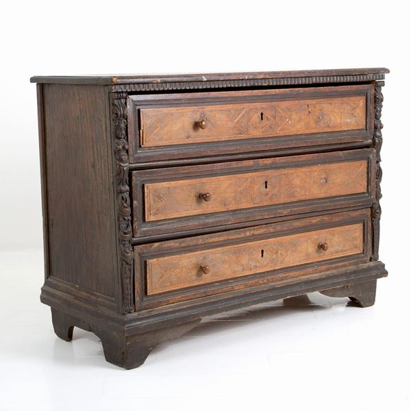 Cassettone a tre cassetti in legno con lesene scolpite a cariatidi. Area bergamasca. XVII secolo. Difetti e mancanze.