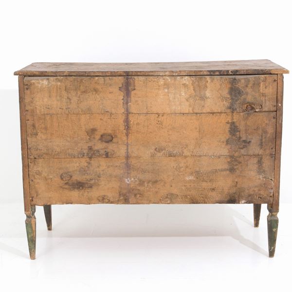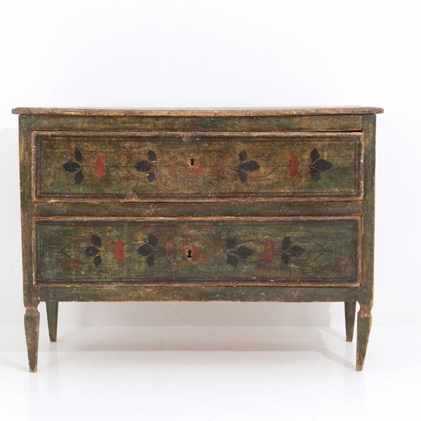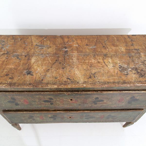 Cassettone a due cassetti in legno laccato a motivi floreali. XVIII secolo. Difetti.