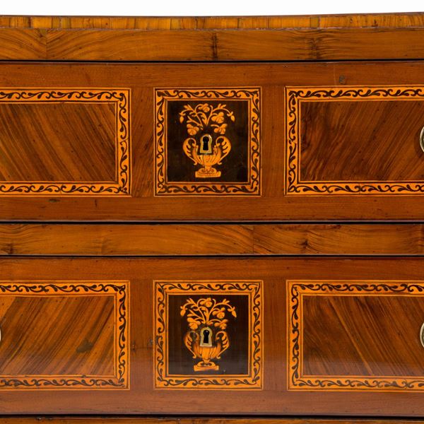 Cassettone lastronato in legni vari e intarsiato a motivi floreali. Napoli. Periodo Luigi XVI.