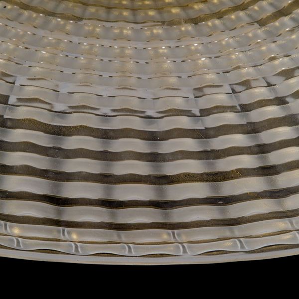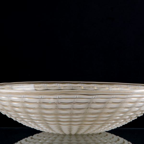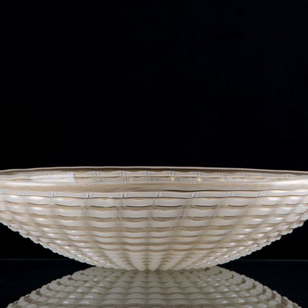 Centrotavola in pasta di vetro di Murano ondulato trasparente e lattimo lumeggiato in oro.