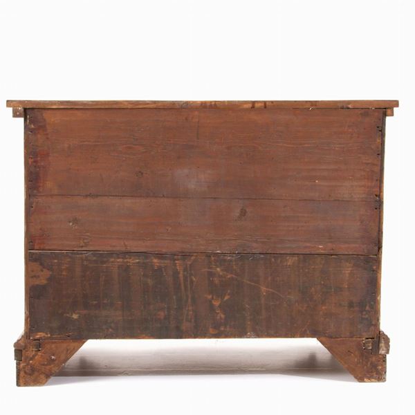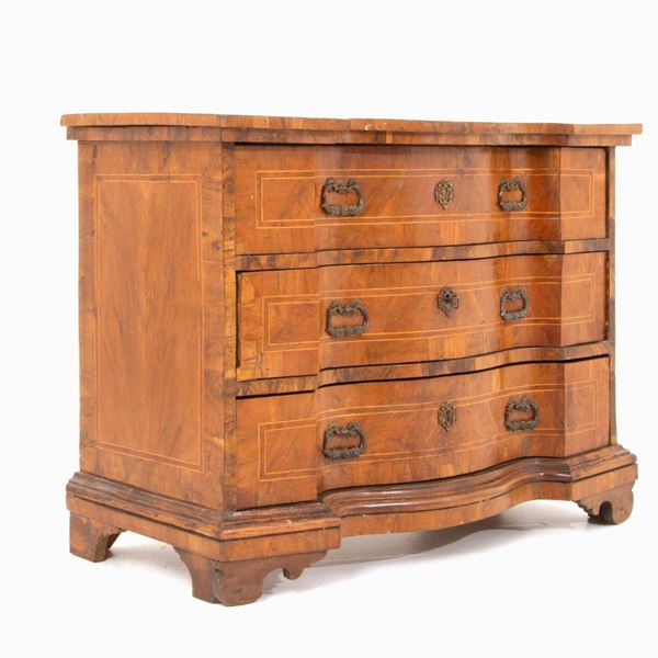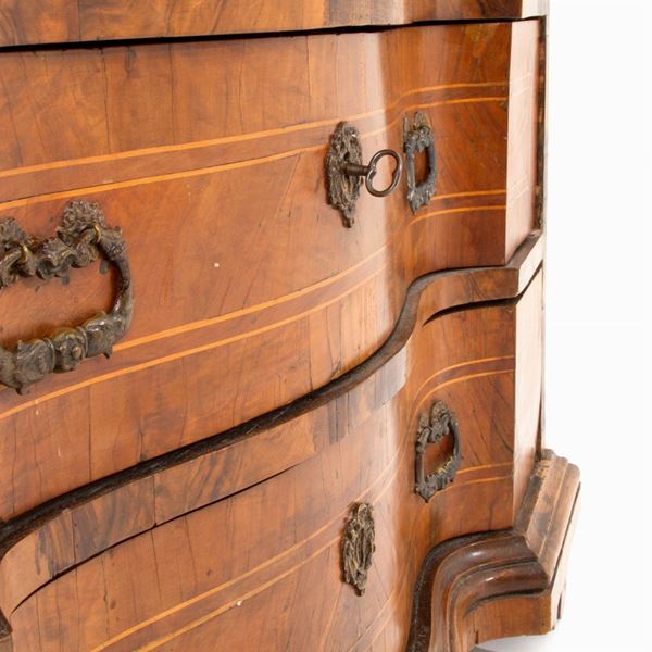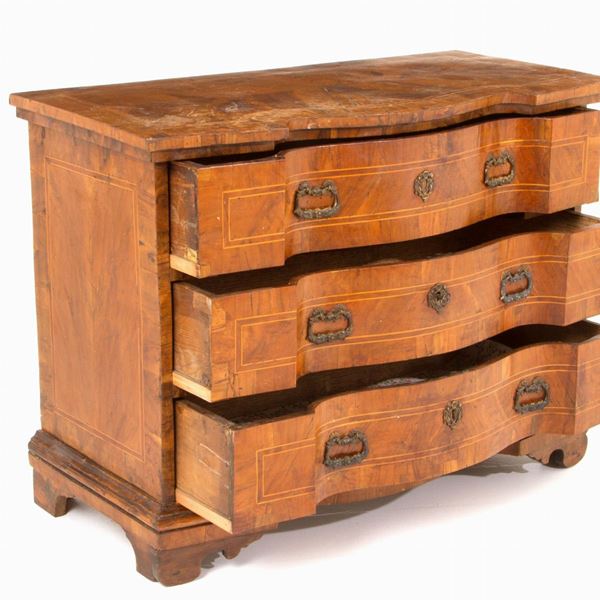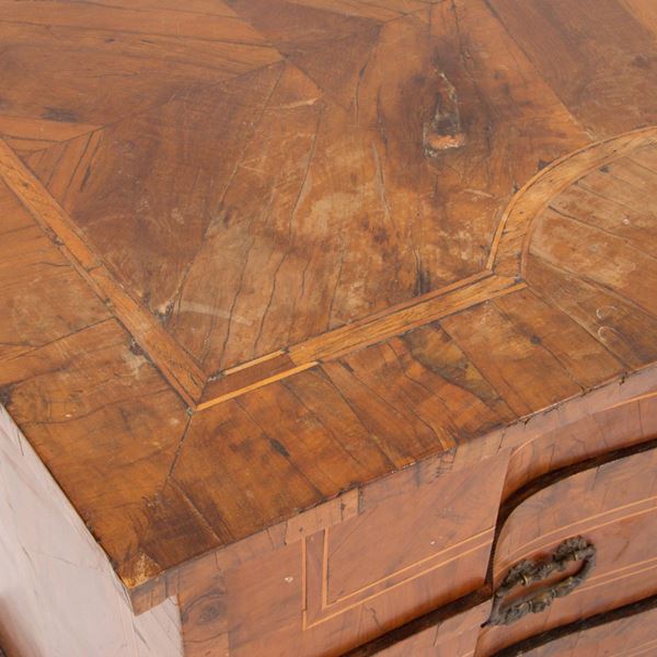 Comò doppia mossa sul fronte in legno intarsiato, lastronato in radica e filettato. Veneto. XVIII secolo. Difetti.
