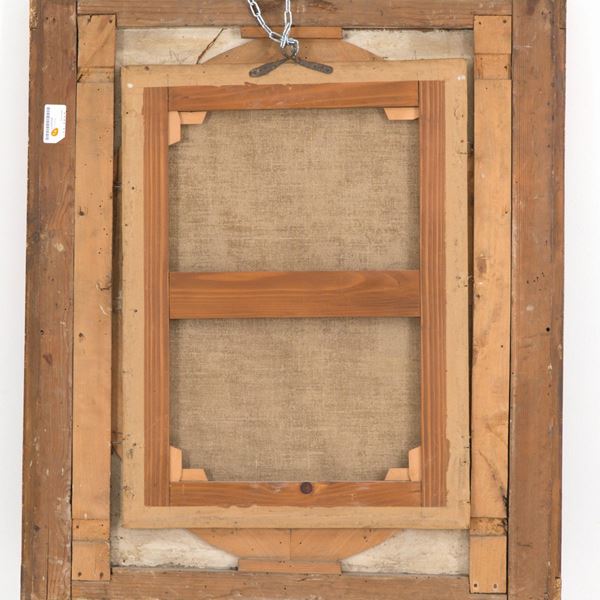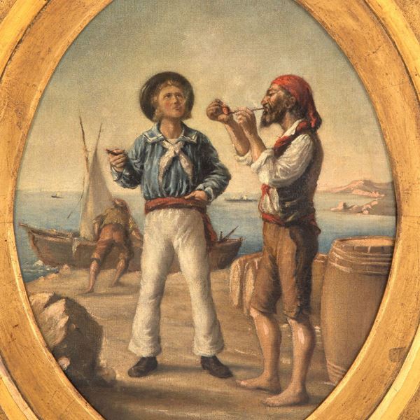 Dipinto olio su tela raffigurante "FUMATORI DI PIPA AL PORTO". XIX secolo. In cornice intagliata e dorata.