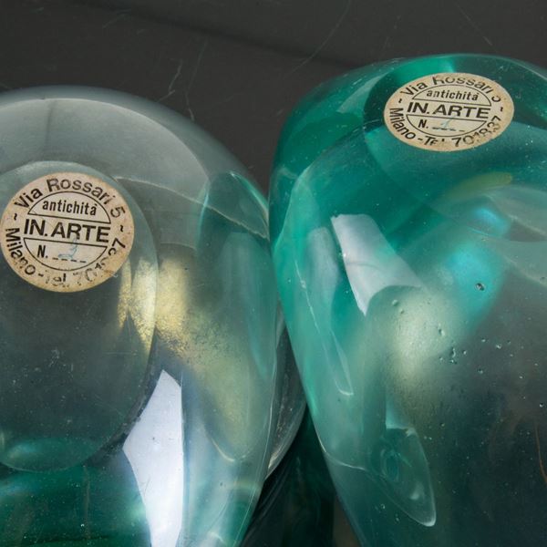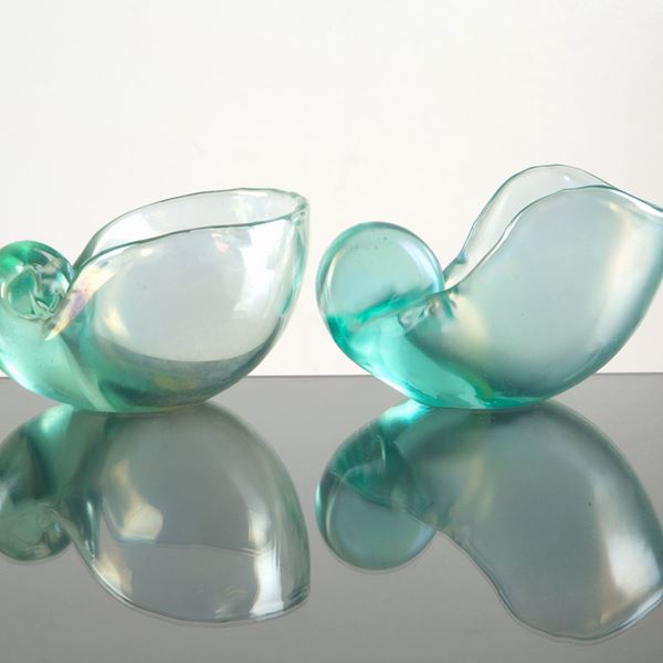 Due conchiglie in pasta di vetro di Murano color acquamarina. Forme e misure leggermente diverse (23x20x14 cm ca. una e 23x21x11 cm ca. l'altra).