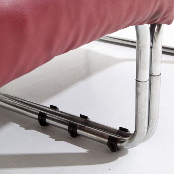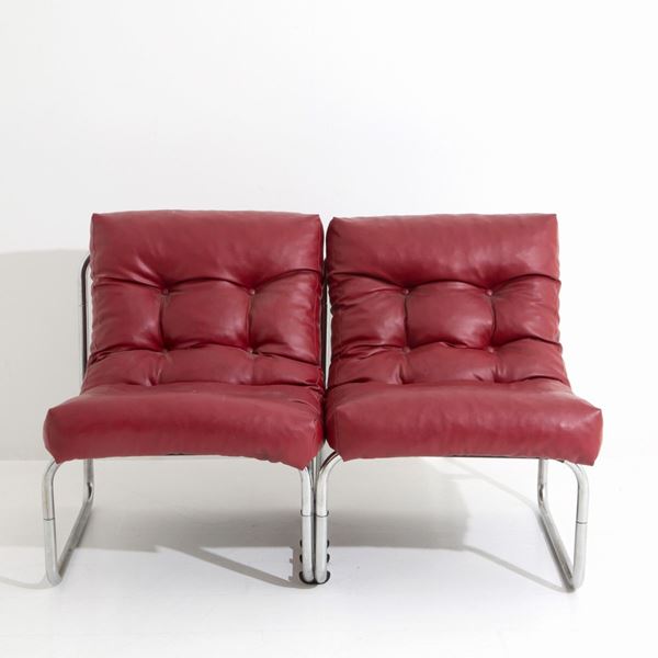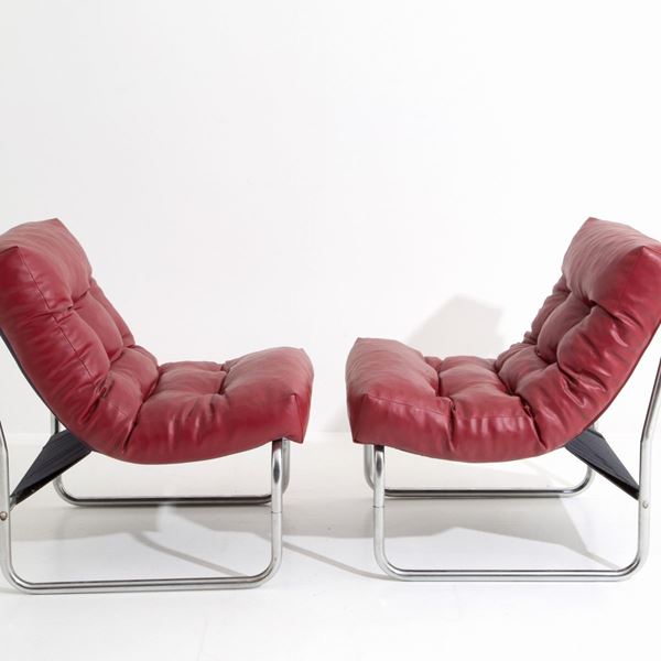 Due poltrone vintage in metallo, stoffa e sky. Anni '80. Lievi segni di usura del tempo.