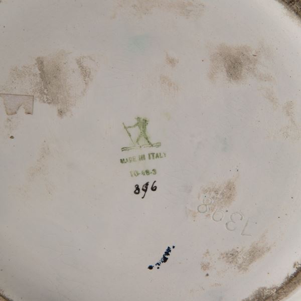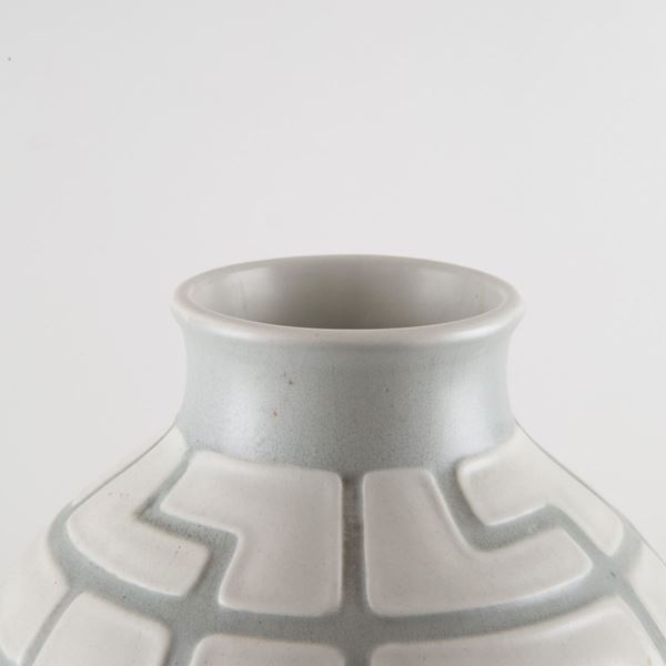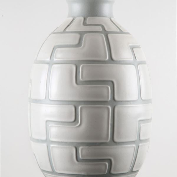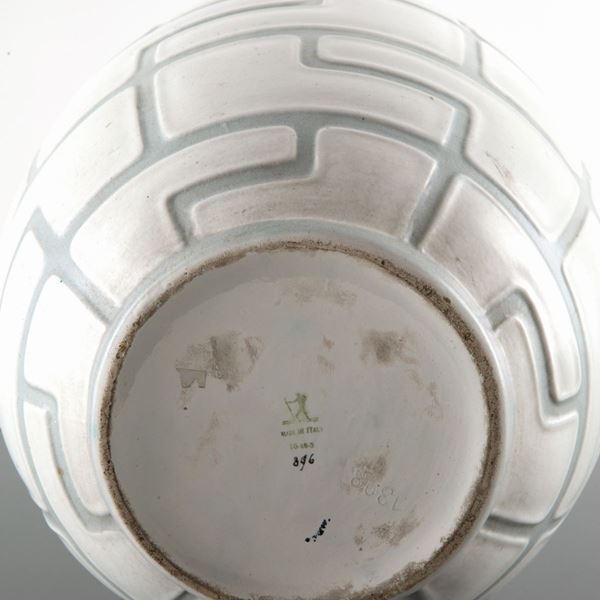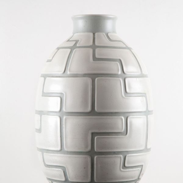Vaso in ceramica modello 7398 con rilievi smaltati in bianco su fondo grigio. Produzione RICHARD GINORI, San Cristoforo. Con marchio della manifattura e numerale 1398 incusso sul fondo.
