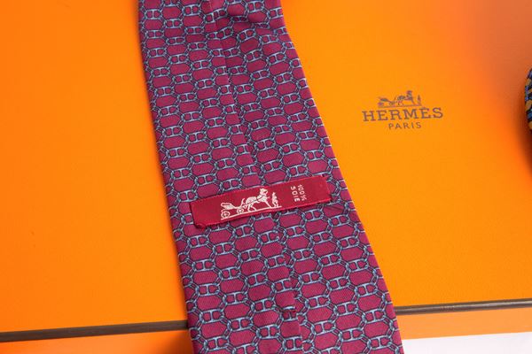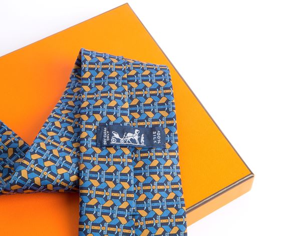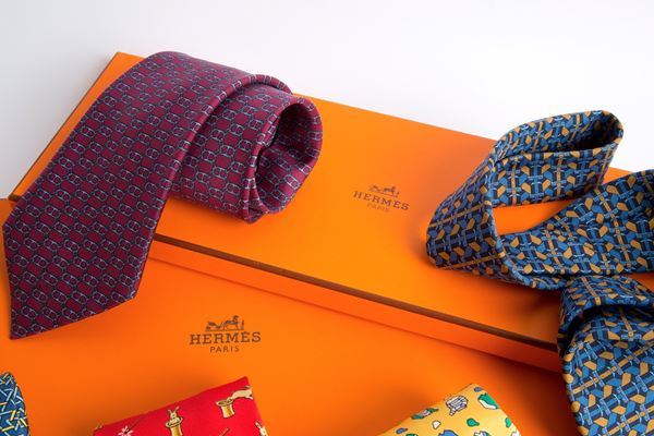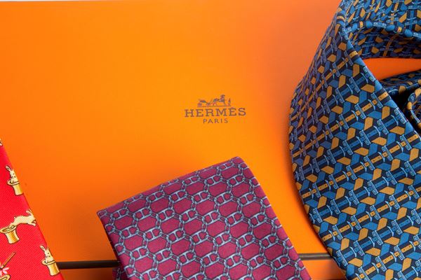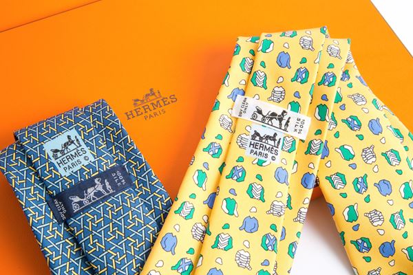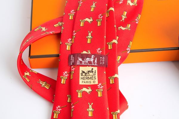 HERMES. Cinque cravatte in seta, due di colore blu e una bordeaux a motivi geometrici, una gialla con disegni di maglioni e cappelli e una rossa con conigli che escono dai cappelli magici. Con scatola originale.