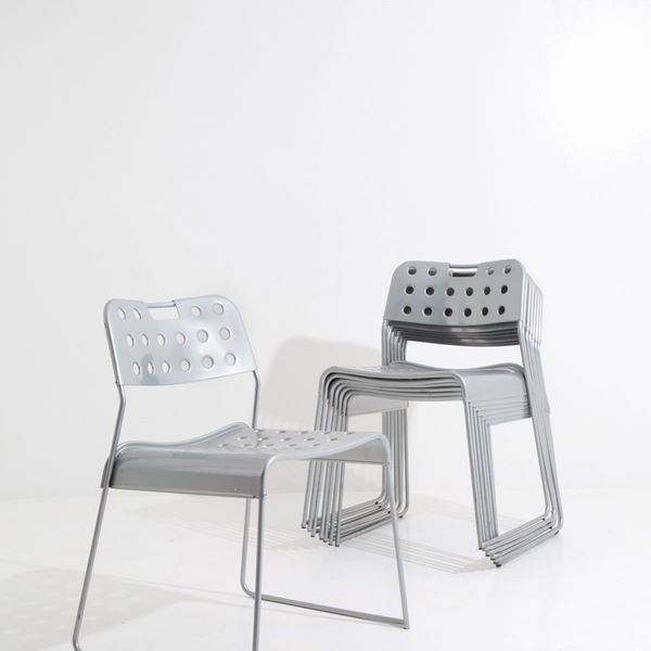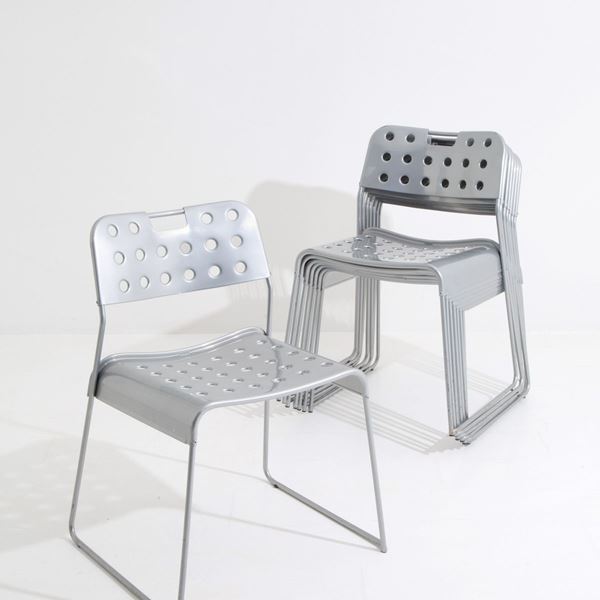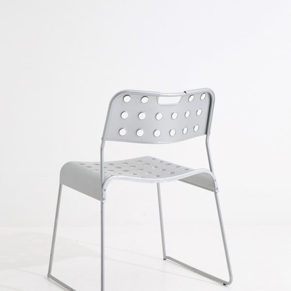 Otto sedie White Omstak con struttura in tondino d'acciaio e seduta e schienale in metallo traforato e verniciato. Produzione BIEFFEPLAST. Anni '90.