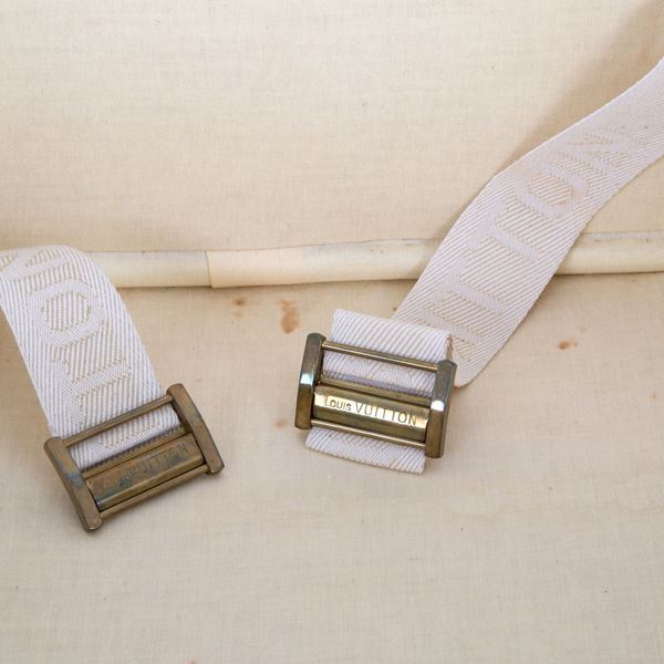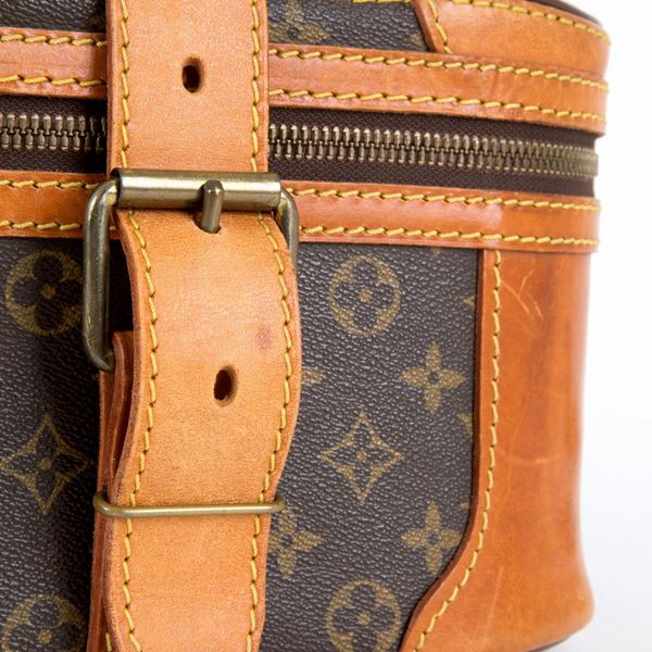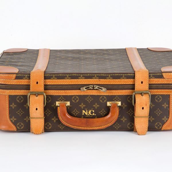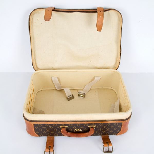 LOUIS VUITTON. Valigia Stratos con manico, cinghie e bordi in pelle marrone chiaro. Monogrammata N.C. sul bordo.