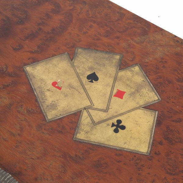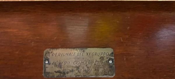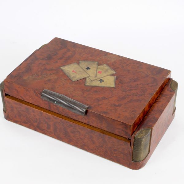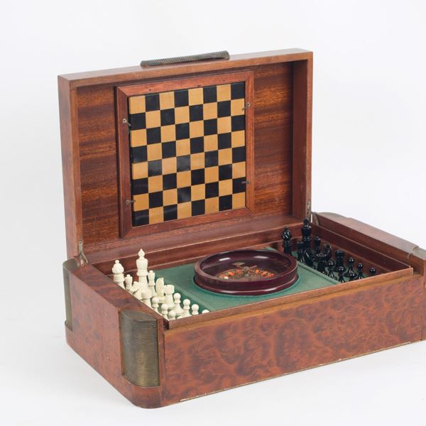 Scatola da gioco in legno lastronato in radica di betulla con finiture in ottone e bronzo, completa di scacchi e roulette. Con targhetta 'Donata dal personale del XI Gruppo al suo comandante. VI.XI.XVIII'. Segni di usura.