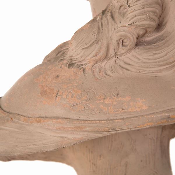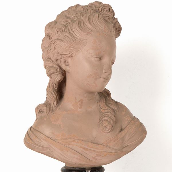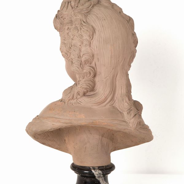 Scultura in terracotta raffigurante "BUSTO DI FANCIULLA". Firmata HOUDON, Paris sulla spalla. Base in marmo. Seconda metà XIX secolo.
