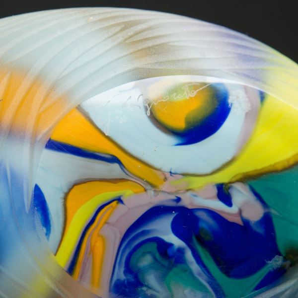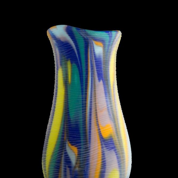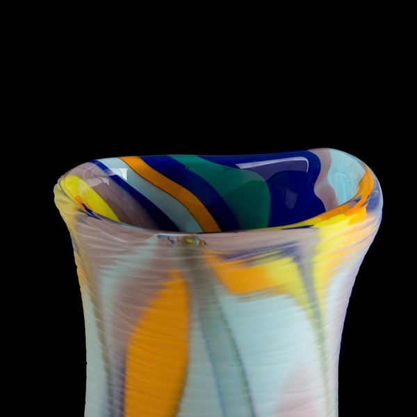 Vaso in vetro di Murano variopinto satinato e zigrinato. Firmato sul fondo.