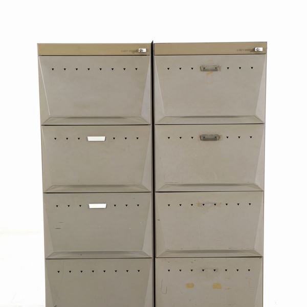Coppia di schedari a quattro cassetti in metallo grigio. Serie Synthesis. Produzione OLIVETTI. Anni '60. Segni di usura.