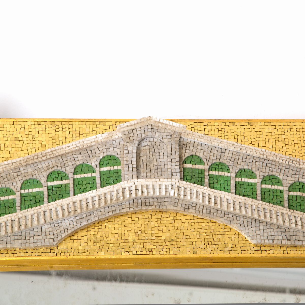 Specchiera in legno rivestito a micromosaico raffigurante "CAMPANILE DI SAN MARCO, PONTE DI RIALTO, COLONNA DI SAN MARCO E QUATTRO LEONI AGLI ANGOLI". Segni di usura del tempo.