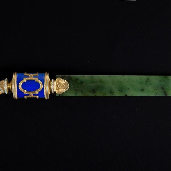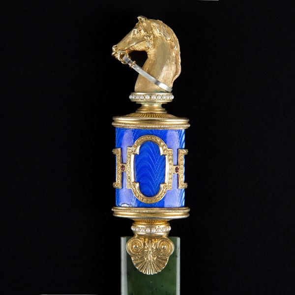 Tagliacarte in giada, argento cesellato, dorato e smalto con impugnatura a testa di cavallo. Russia. XX secolo.