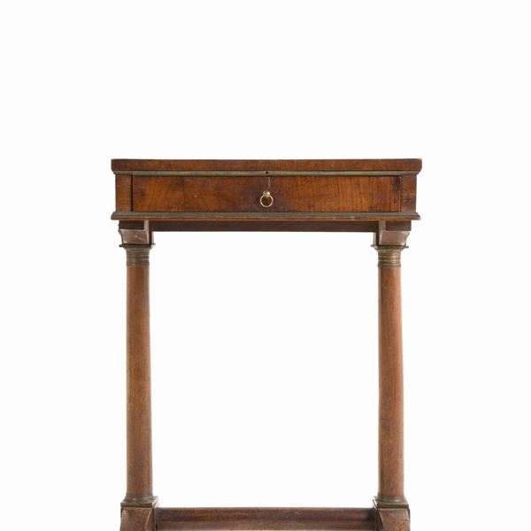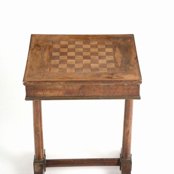 Tavolino da gioco in legno con piano intarsiato a scacchiera e profili in ottone. XIX secolo. Difetti.