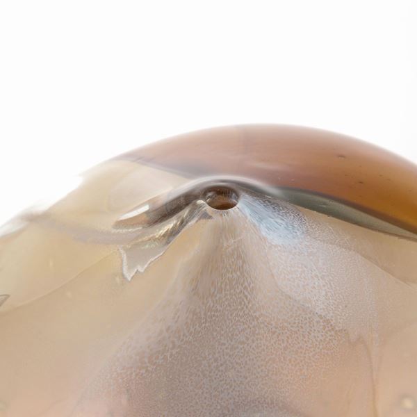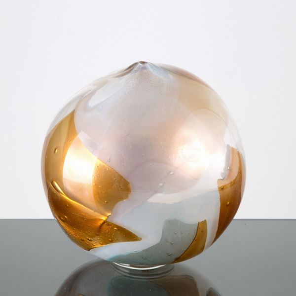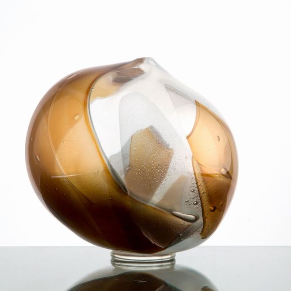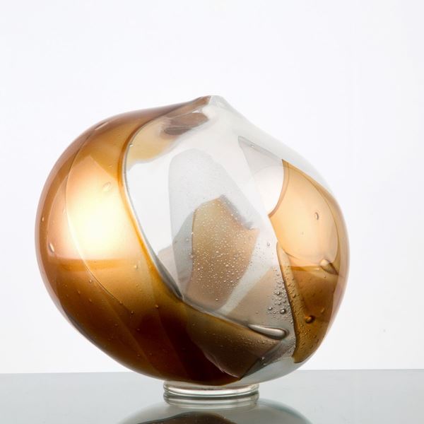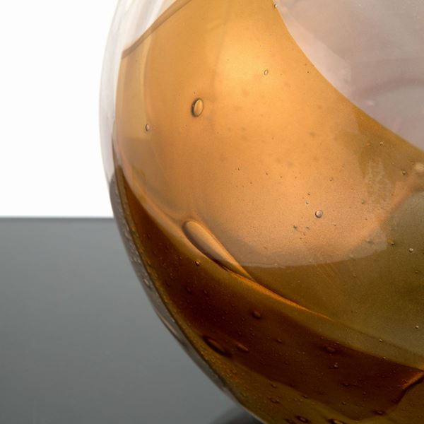 Vaso a boccia in vetro soffiato di Murano trasparente e color ambra con lumeggiature in oro.