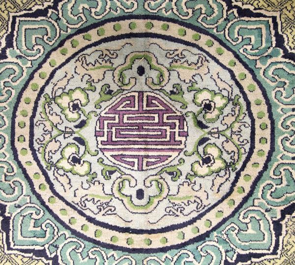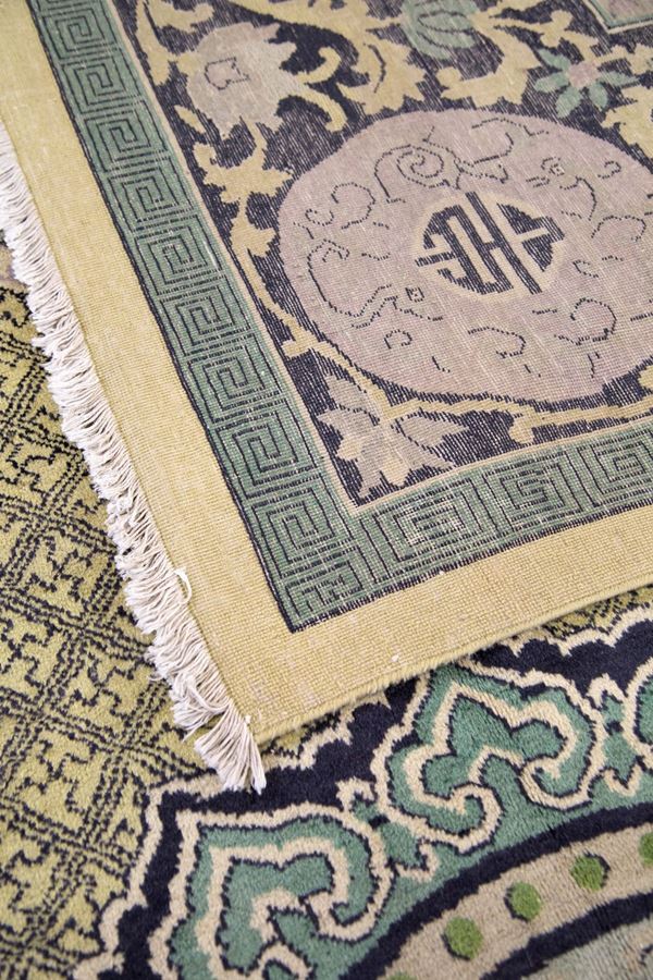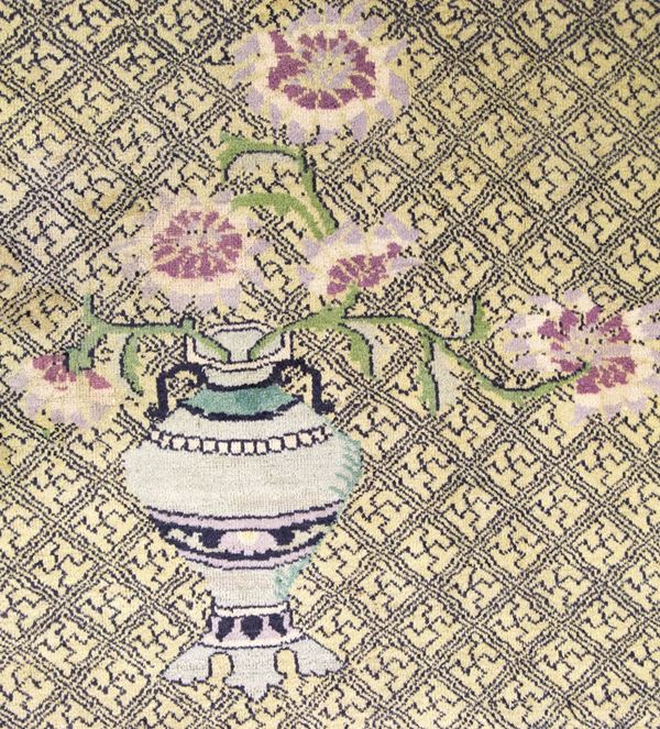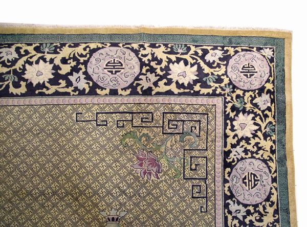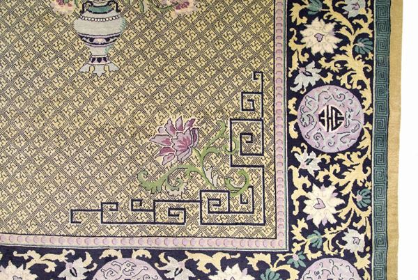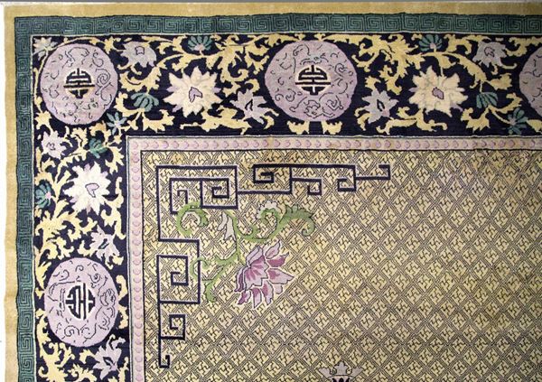 Tappeto Indo Cina. Prima metà del XX secolo. Ottimo stato di conservazione, senza restauri. Date le dimensioni del tappeto, la foto principale è frutto dell'unione di più scatti.