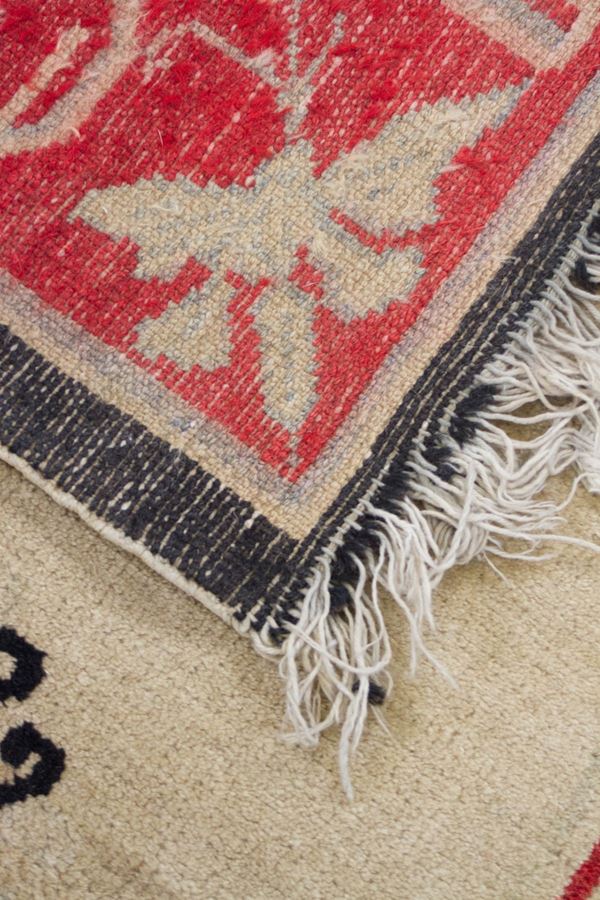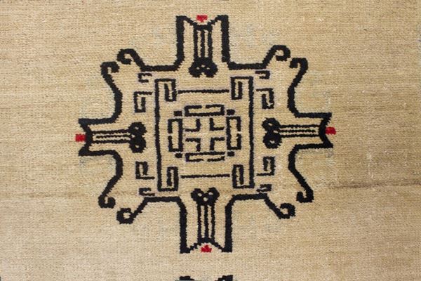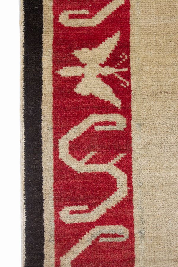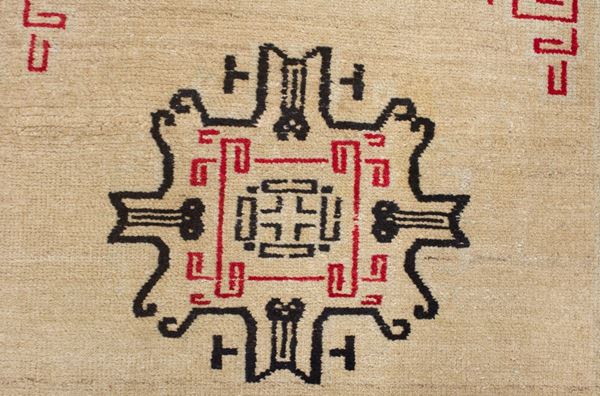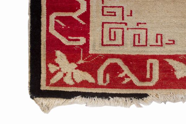 Tappeto Tibet. Turkestan Orientale. Prima metà del XX secolo. Campo in vello, testate danneggiate.