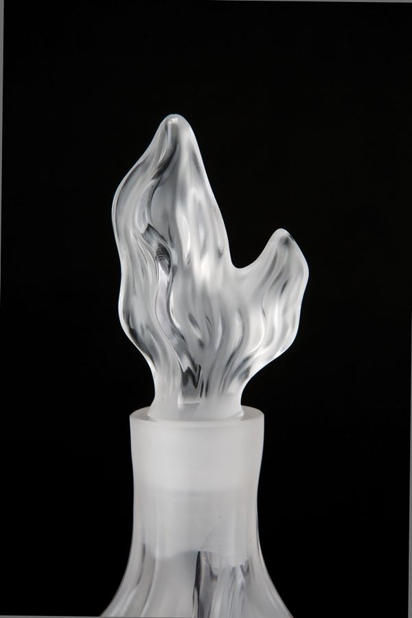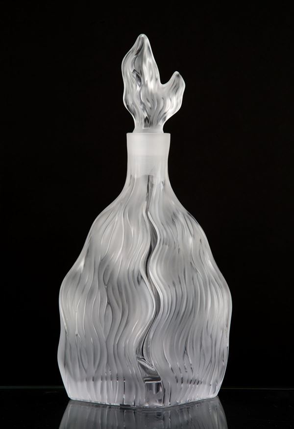 Bottiglia con tappo a onde in vetro soffiato trasparente parzialmente satinato. Manifattura CRISTALLERIE DE HAUTE BRETAGNE. Marchio all'acido sul fondo.