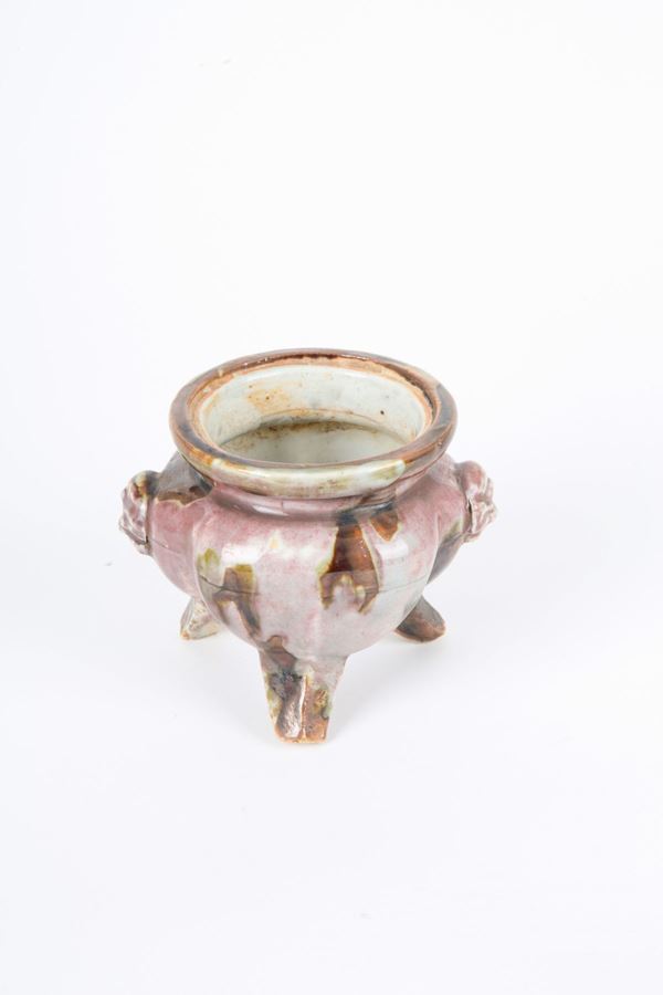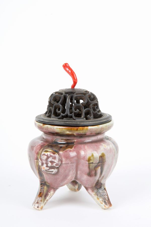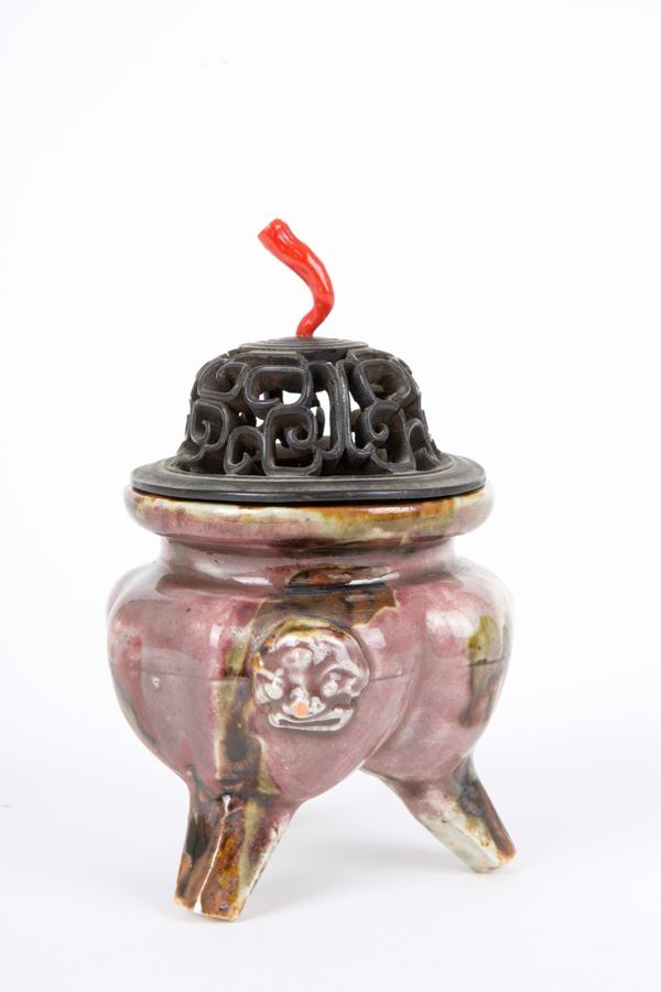Bruciaprofumi in porcellana invetriata con coperchio in legno traforato e manico in corallo. Cina.