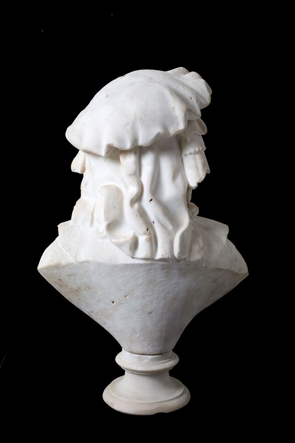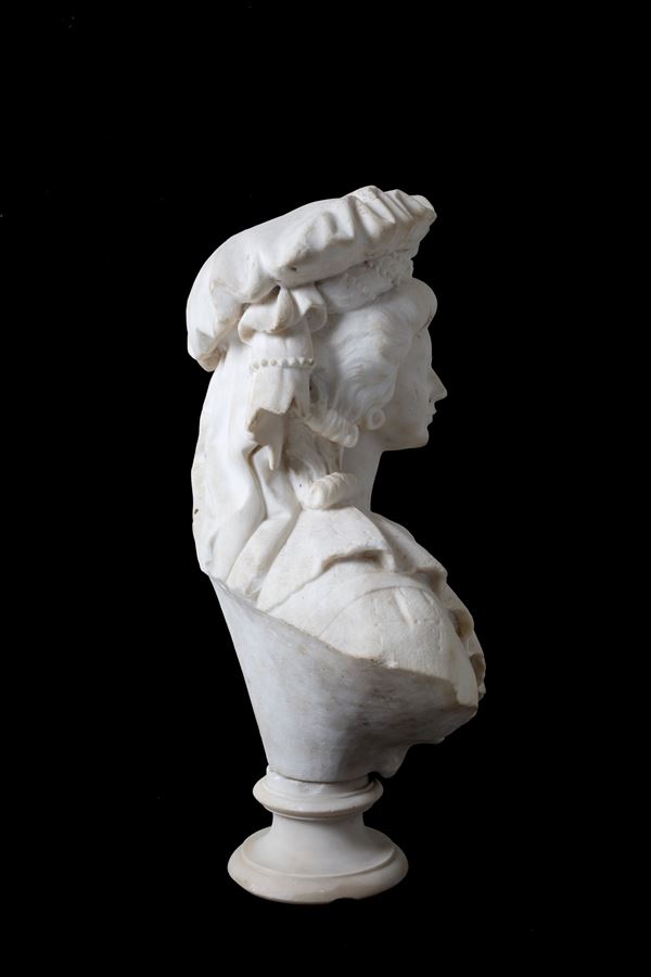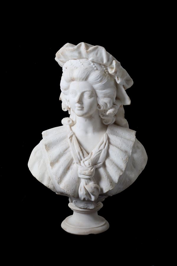 Busto in marmo bianco raffigurante "MARIA ANTONIETTA". Base in marmo. XIX secolo. Difetti.
