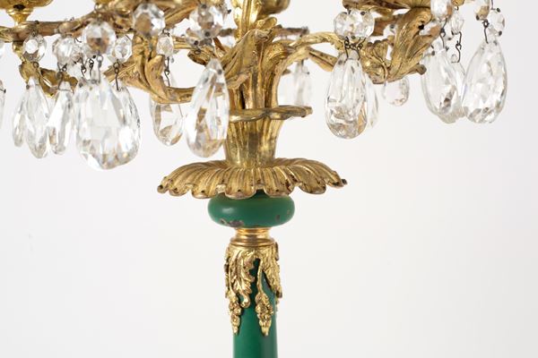 Candelabro sette luci in bronzo cesellato e dorato, lacca verde e gocce di vetro. Fine XIX-inizi XX secolo. Difetti e mancanze.