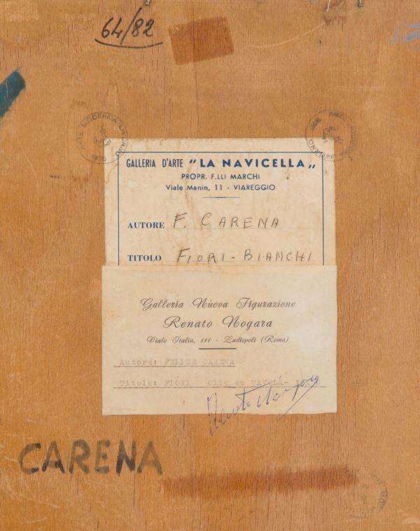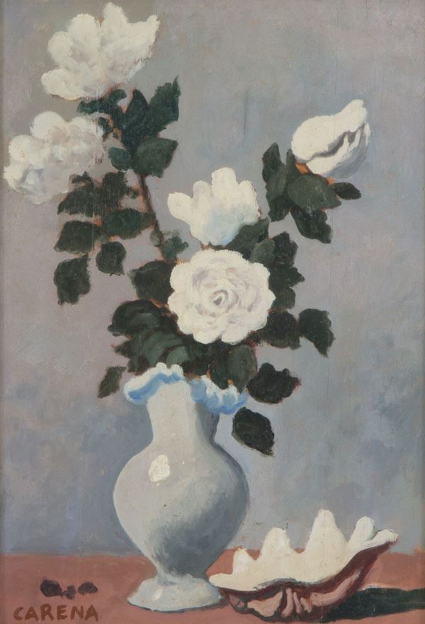 Dipinto olio su compensato raffigurante ''VASO CON ROSE BIANCHE''. Firmato in basso a sinistra. Con cartigli di diverse gallerie d'arte sul retro. In cornice.