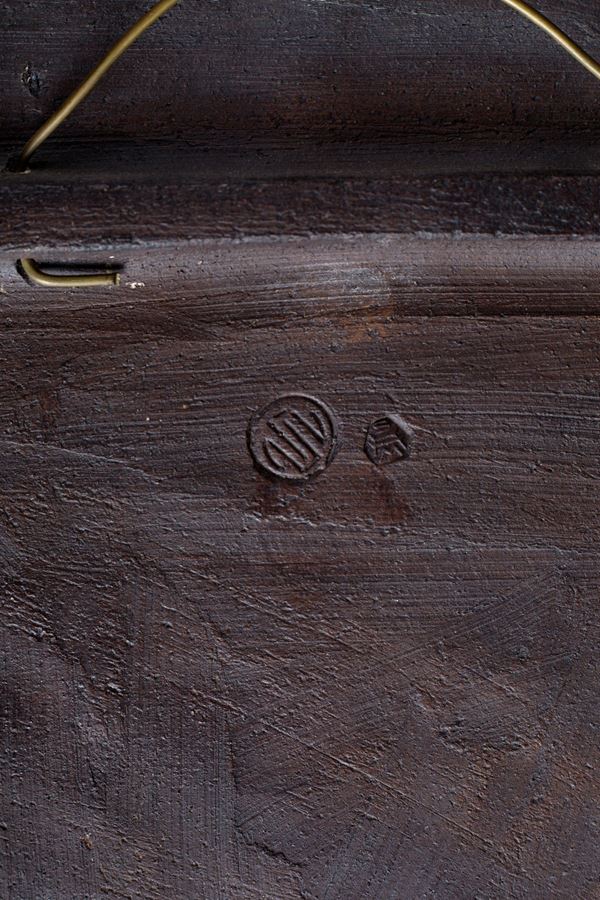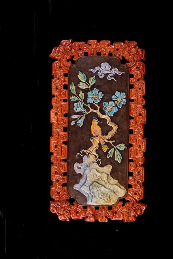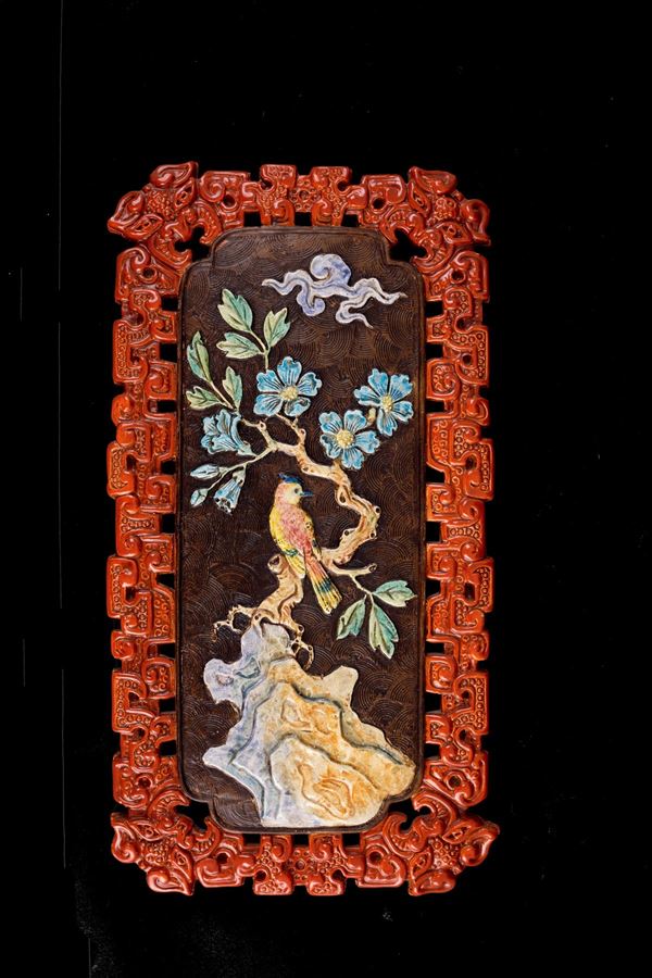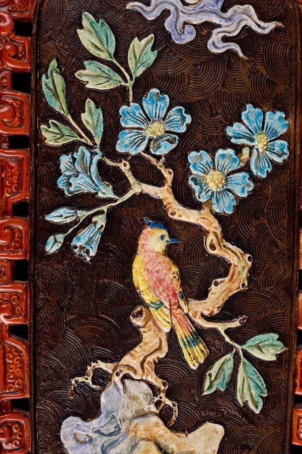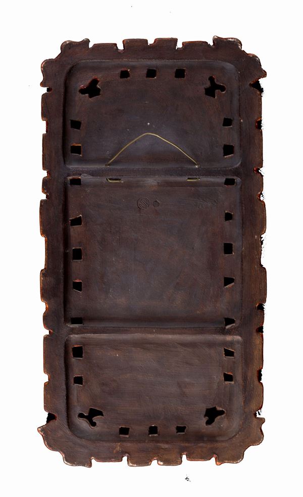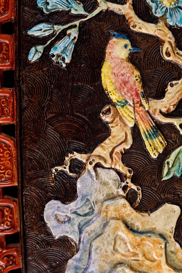 Coppia di placche in terracotta decorate con bonsai. Marcate sul retro. Cina.