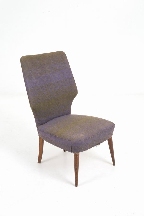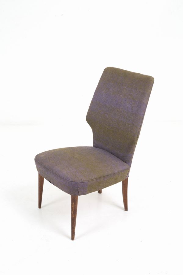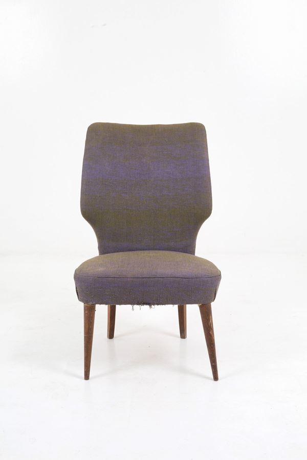Coppia di sedie in legno sagomato con seduta e schienale imbottiti e rivestiti in tessuto viola. Anni '50. Difetti e segni di usura del tempo.