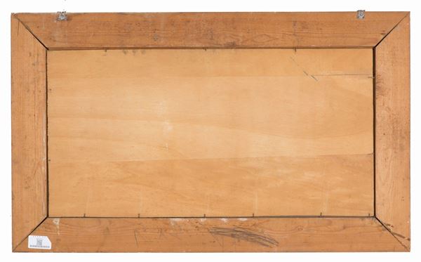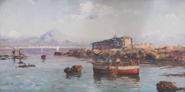Dipinto olio su compensato raffigurante "VEDUTA DI LAGO CON BARCHE". Firmato in basso a sinistra. In cornice.