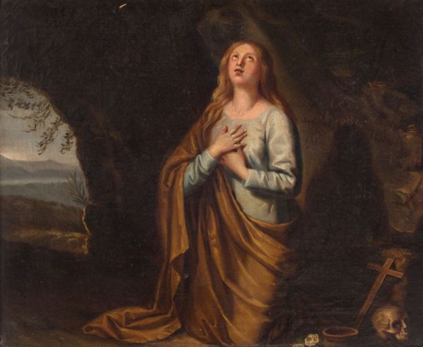 Dipinto olio su tela raffigurante "MARIA MADDALENA PENITENTE". XVII secolo. In cornice dorata. Lievi difetti.