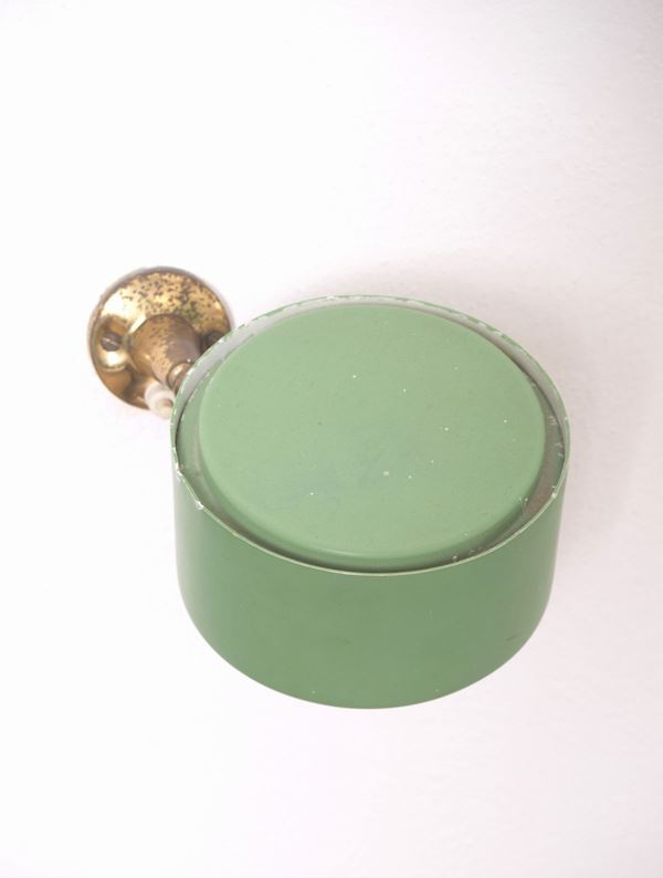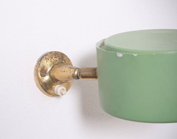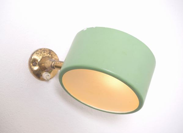 Due applique in ottone, alluminio verniciato verde e vetro opalino. Produzione STILUX (Attr.). Anni '60.