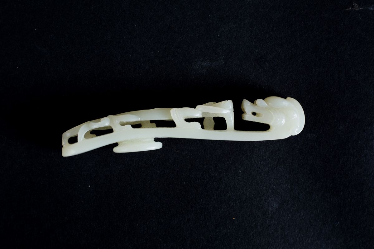 Fibbia in giada scolpita a forma di drago. Cina.