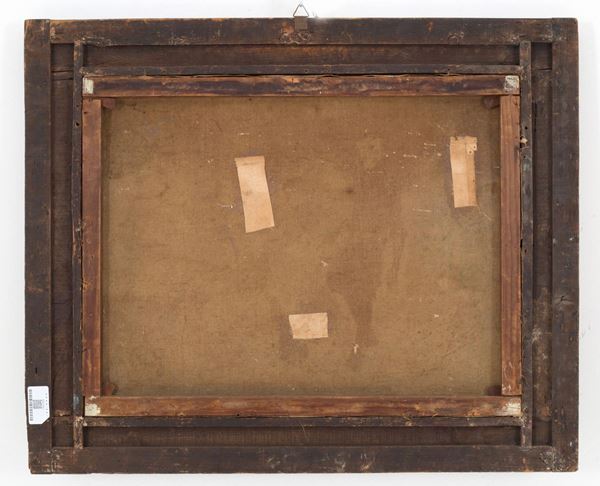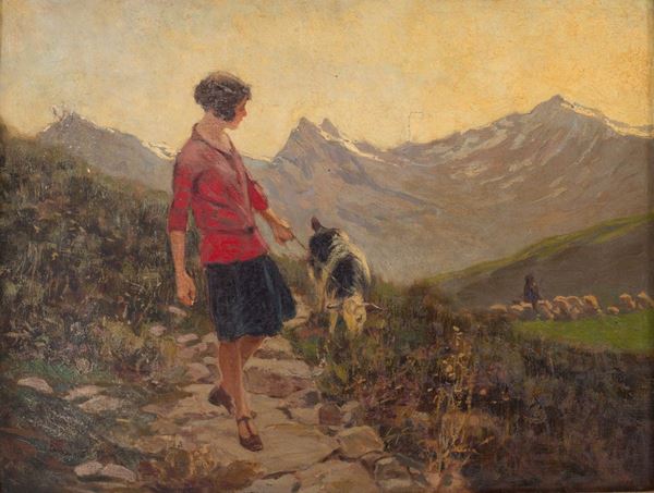 Dipinto olio su tela raffigurante "PAESAGGIO MONTANO CON PASTORELLA". Firmato in basso a destra. In cornice. Difetti.