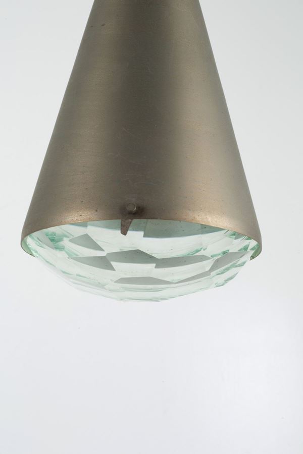 Lampadario modello 1995 in ottone zincato e cristallo. Produzione FONTANA ARTE. Anni '60. Lievi difetti e segni di usura del tempo. Proveniente da una casa toscana in cui era appeso, insieme ad altri cinque lampadari (dal lotto 436 al 440), ad un controsoffitto in gesso dipinto (lotto 441), su probabile disegno di Gio Ponti (vedi ultima foto).