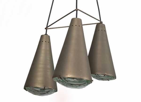 Lampadario a sospensione modello 2126 con tre diffusori in ottone zincato e cristallo. Produzione FONTANA ARTE. Anni '60. Lievi difetti e segni di usura del tempo.