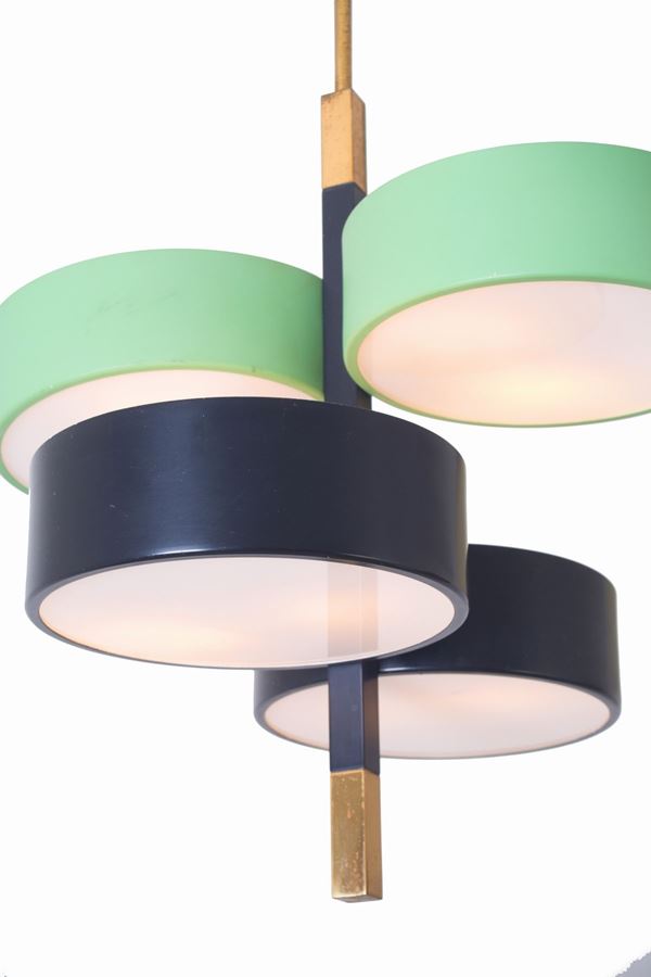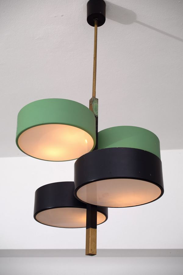 Lampada a sospensione in ottone, alluminio verniciato verde e nero e plexiglass opalino. Produzione STILUX. Anni '60.
