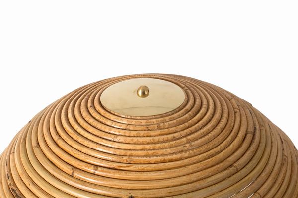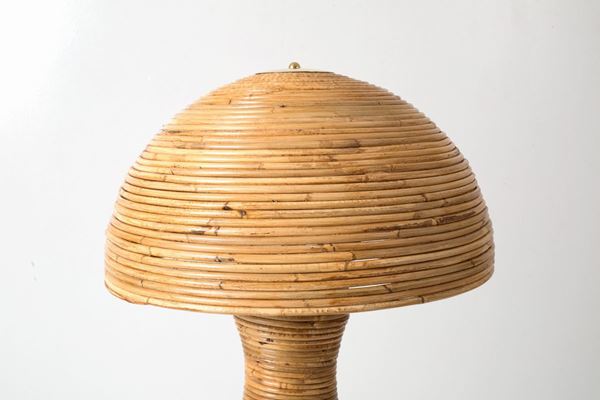 Lampada da tavolo due luci in midollino, ottone e metallo dorato a forma di fungo. Anni '80.