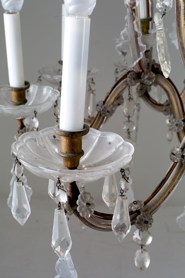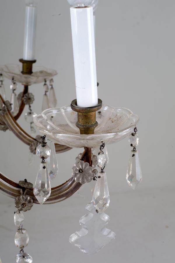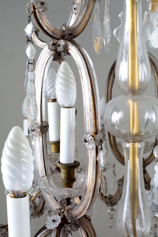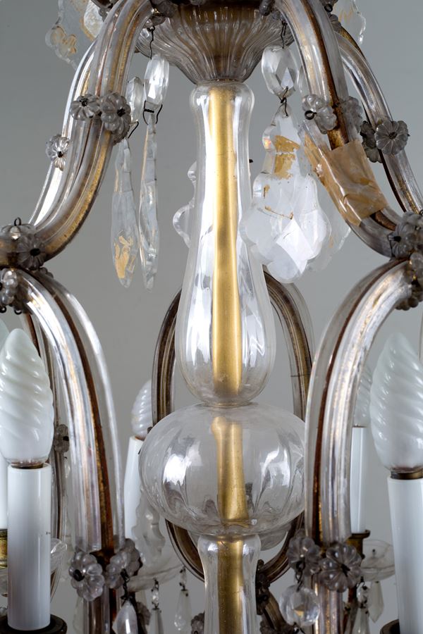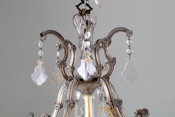 Lampadario modello Maria Teresa quattordici luci con gocce in vetro molato. XX secolo. Mancanze.