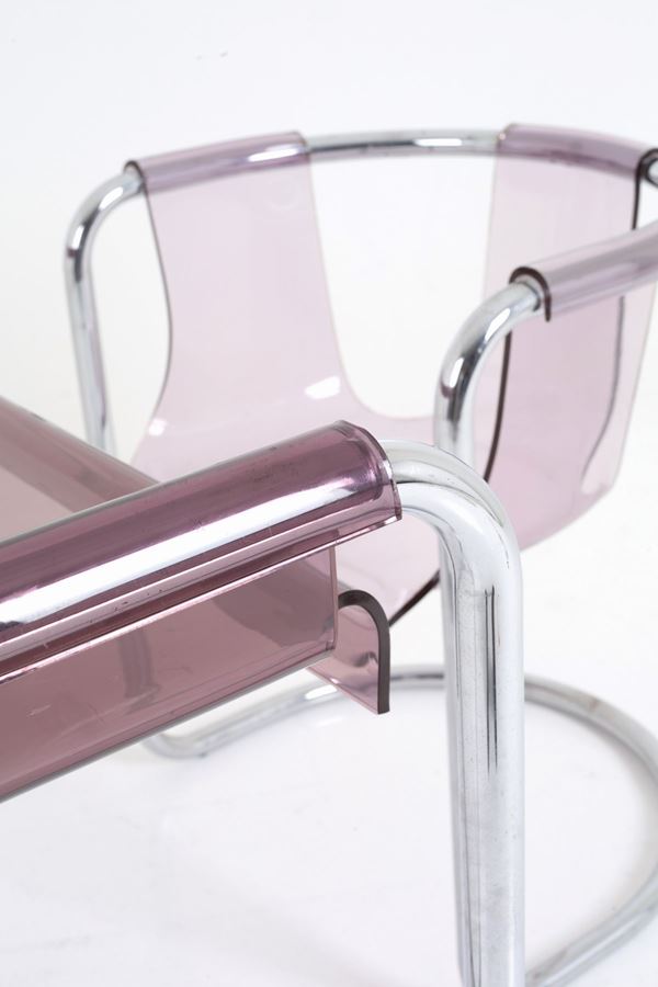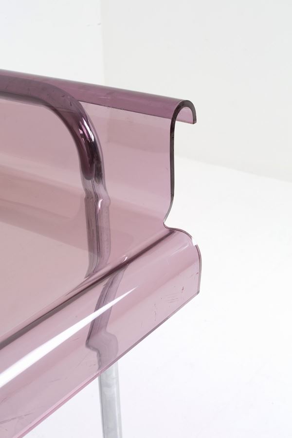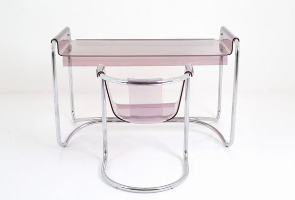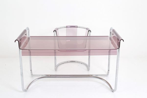 Scrivania con piano scorrevole e sedia a pozzetto in metallo cromato tubolare e plexiglass lilla. Produzione FORMES NOUVELLE. Anni '70. Segni di usura del tempo.
