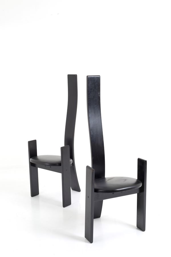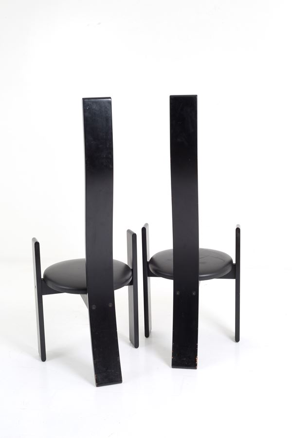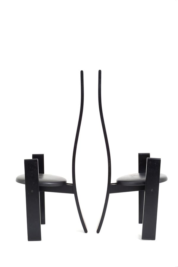 Due sedie SD51 Golem in legno laccato nero con sedili rivestiti in pelle nera. Produzione POGGI, Pavia. 1968. Segni di usura del tempo.