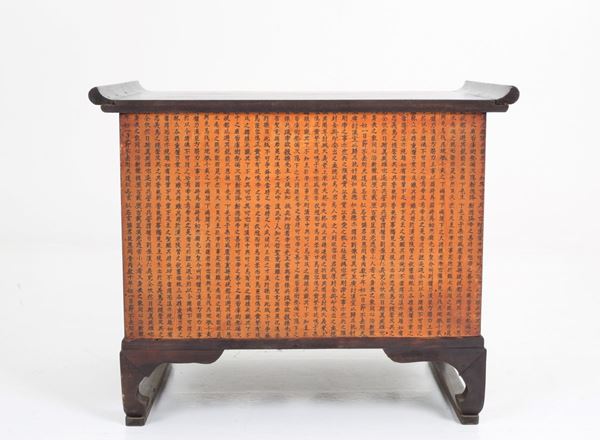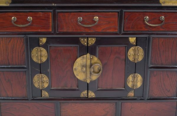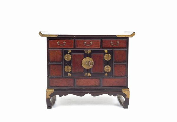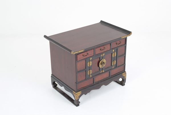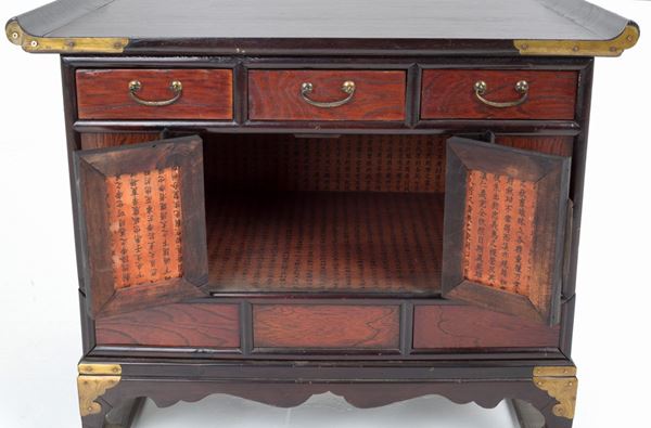 Piccolo mobiletto in legno con guarnizioni in ottone a tre cassetti, due sportelli e segreti. Cina. Fine XIX secolo. Difetti e mancanze.