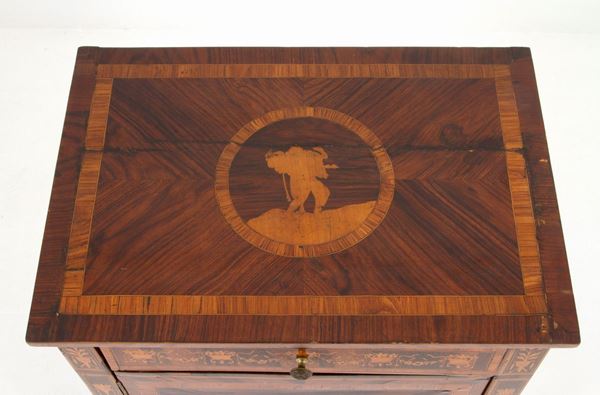 Mobiletto lastronato in legni vari a festoni e medaglioni sul piano e sul fronte. Con cassetto sulla fascia e gambe piramidali. Luigi XVI. Lombardia. Difetti.