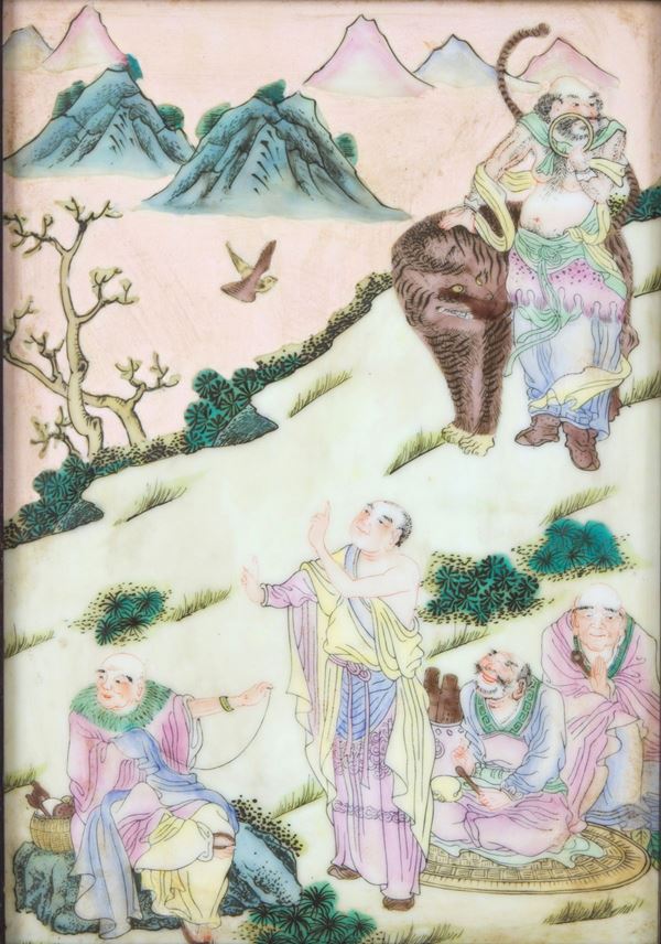Placca in ceramica policroma raffigurante "SCENA DI VITA ORIENTALE". Cina. In cornice in legno ebanizzato.
