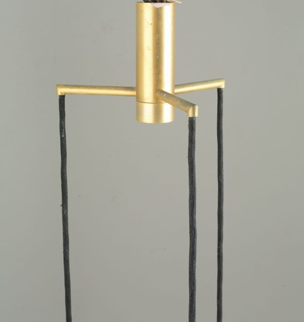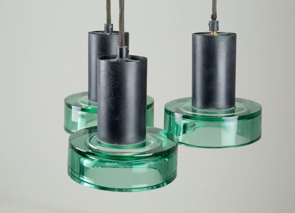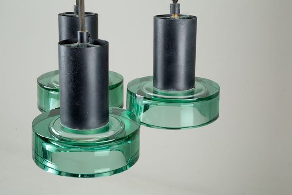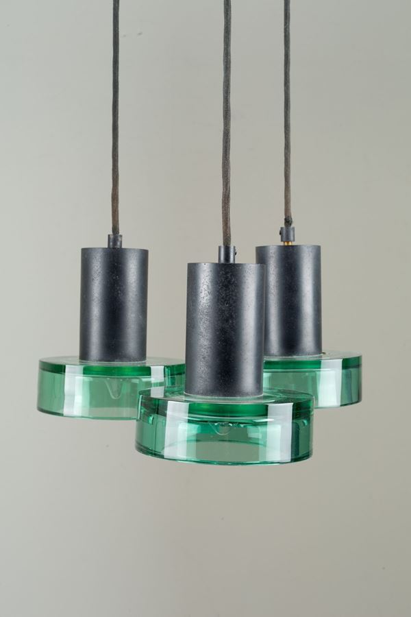 Lampada a sospensione a tre luci in ottone, metallo verniciato nero e vetro nei toni del verde. Produzione ARCHIMEDE SEGUSO. Anni '60. Difetti e segni di usura del tempo.