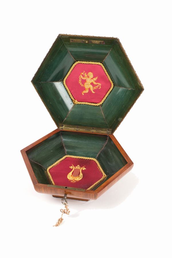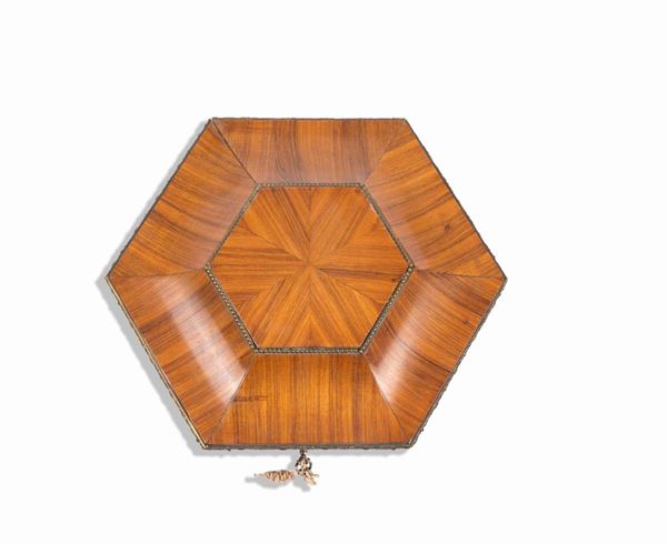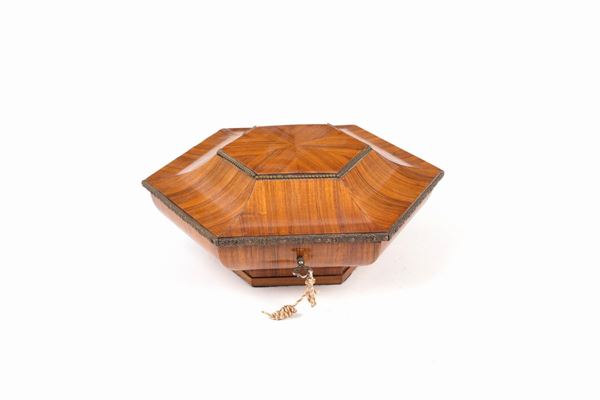 Scatoletta di forma esagonale lastronata in bois de rose con finiture in bronzo. Fine XIX secolo.