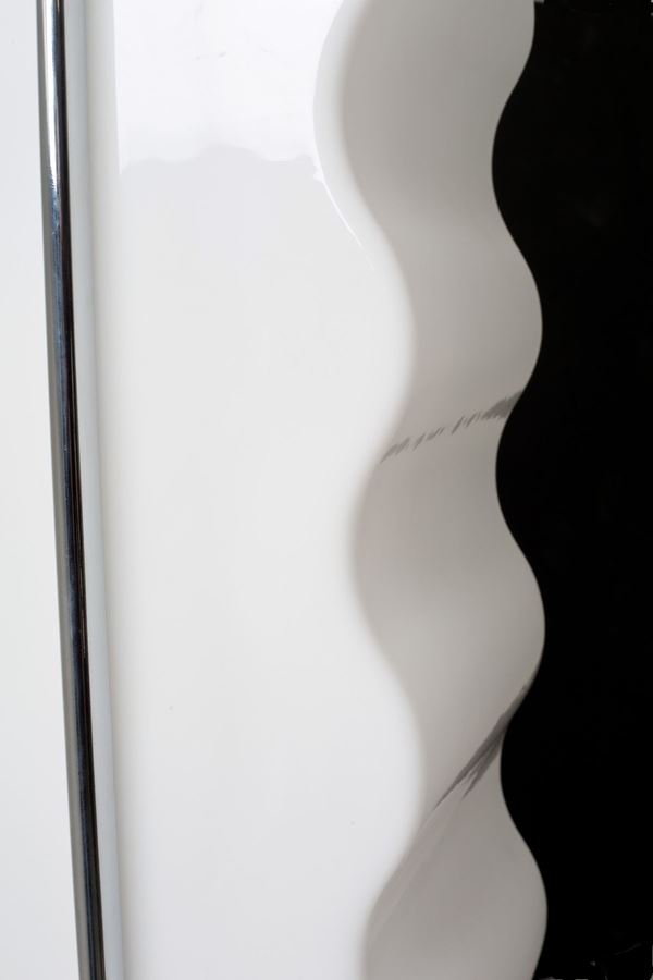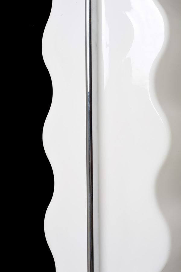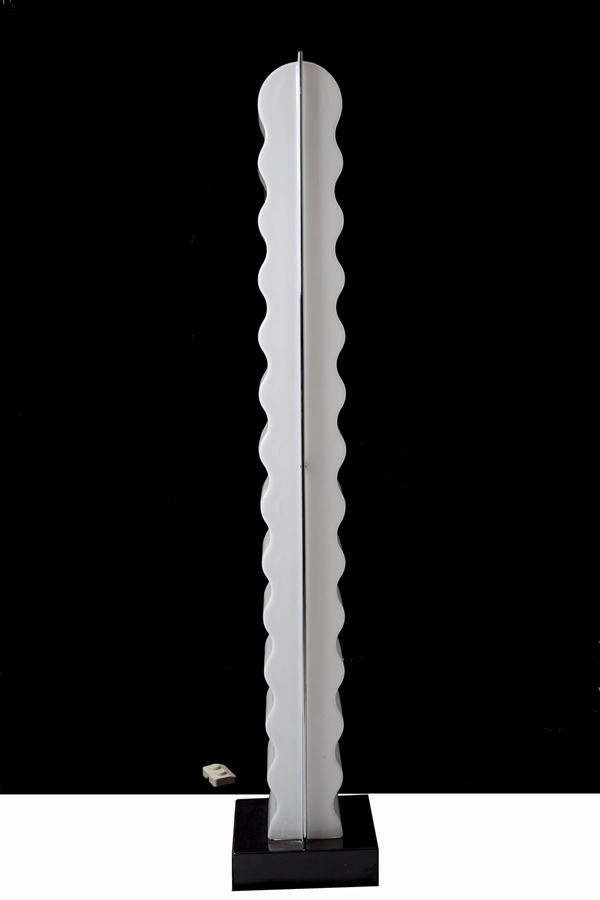 Lampada da terra Cometa in alluminio laccato nero, metallo cromato e diffusore in materiale plastico bianco ondulato. Produzione POLTRONOVA. Anni '70. Segni di usura del tempo.