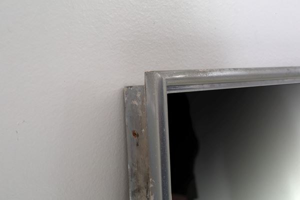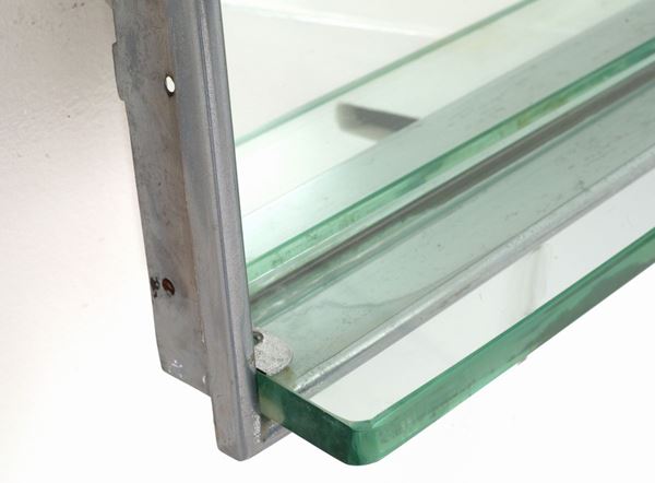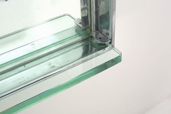 Specchiera rettangolare da incasso in metallo cromato con mensola in vetro. Produzione FONTANA ARTE (Attr.). Anni '60. Difetti e segni di usura del tempo.