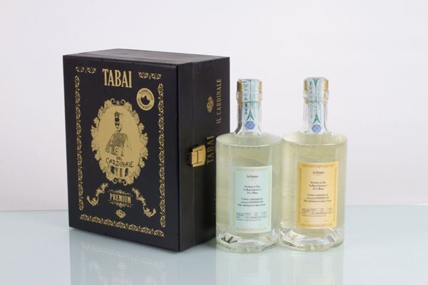 Due bottiglie di Tabai Gin del Cardinale Premium, di cui una di Liquorice Gin e una di Ice Green Gin. Platinum Edition. Cofanetto originale nero.